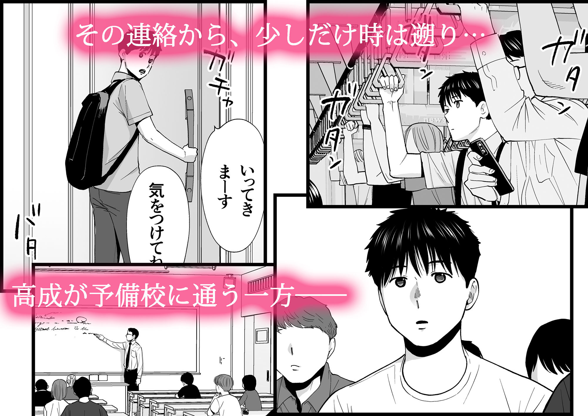 夏休み期間、高成が不在の状況で、貴史・飯田・新山の関係は閉じた空間の中で変質していく。特に貴史と飯田の間では、感情の確認よりも身体的な接触が優先され、関係の定義が曖昧なまま継続していく。飯田は流されやすい性質のまま変化し、主体的な選択というより環境に適応する形で関係を受け入れていく。一方で貴史は主導的立場に立ち、行為を通じて関係の主導権を握る構図が形成される。本編で断片的に描かれた出来事の内側を補完するエピソードとして構成されている。